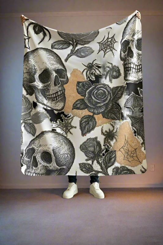 Vintage Gothic Halloween Blanket – Skulls, Spiders, Bats & Roses Pattern