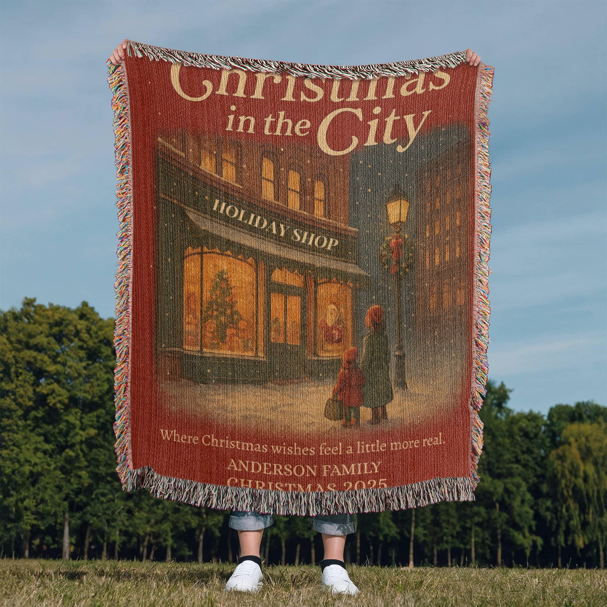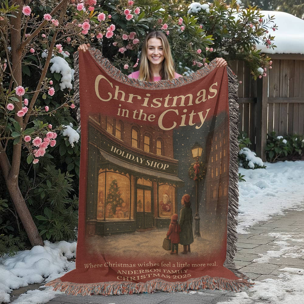 Create a magical holiday keepsake with our Christmas in the City – Personalized Family Woven Blanket. This custom blanket is lovingly woven on a loom with cozy 100% cotton yarn and features a nostalgic city street scene that can be personalized with your family name and year. It’s the perfect gift for your own home, or for parents, grandparents, and loved ones who cherish Christmas traditions and cozy winter nights together.