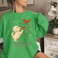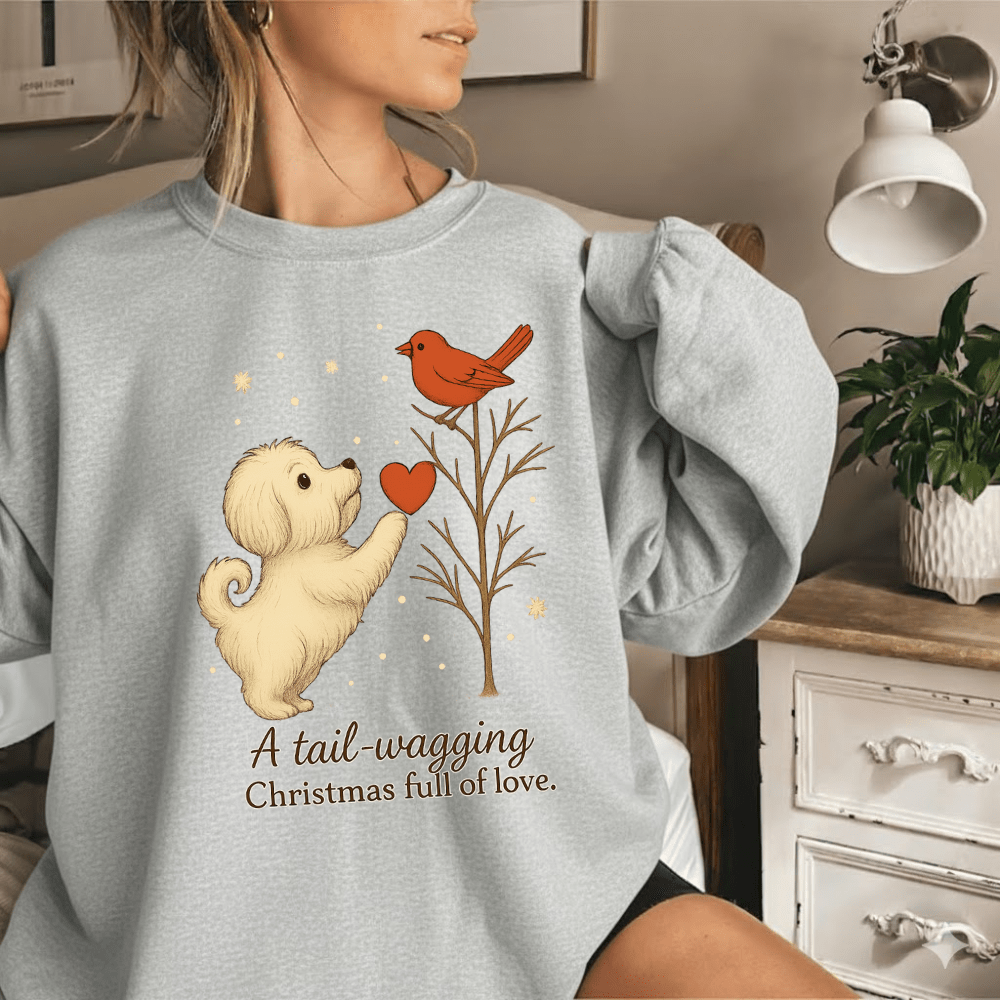 Wrap yourself in holiday spirit with our charming Christmas sweatshirt. Featuring a delightful illustration, this design captures a playful dog reaching up to a bird perched on a branch, with a heart symbol in between. The soft, wintry colors and whimsical elements evoke warmth and joy, perfect for pet lovers and holiday enthusiasts alike.