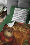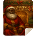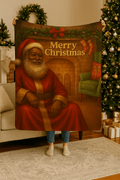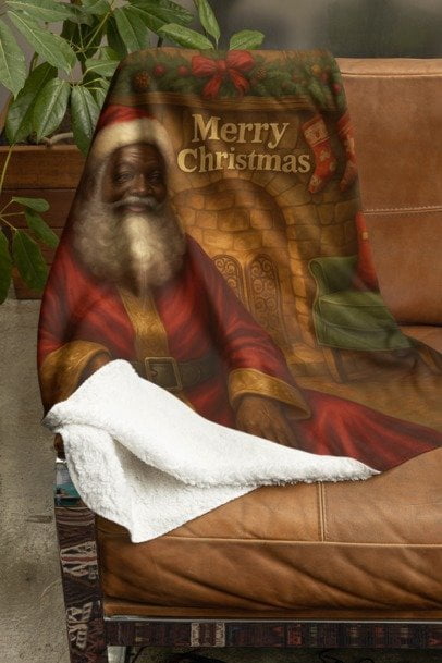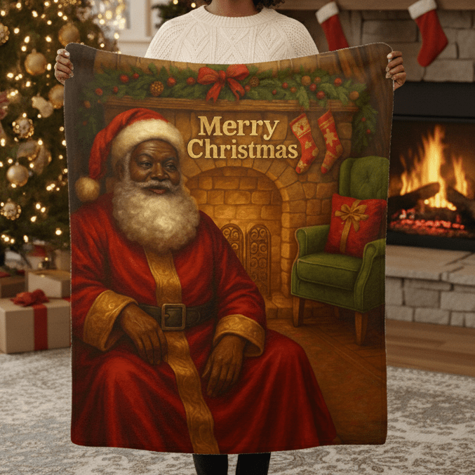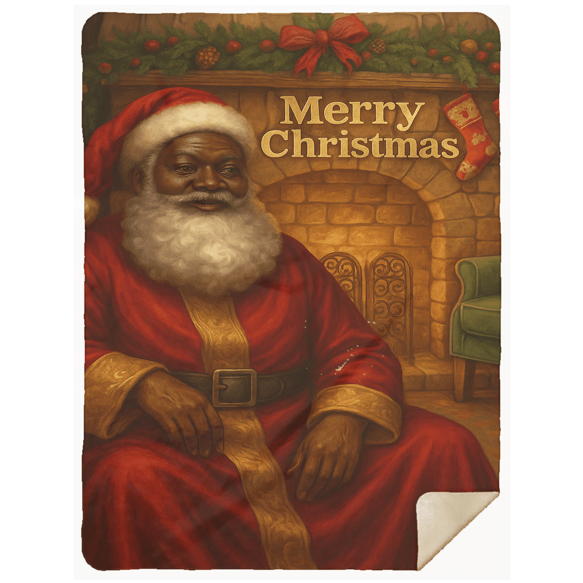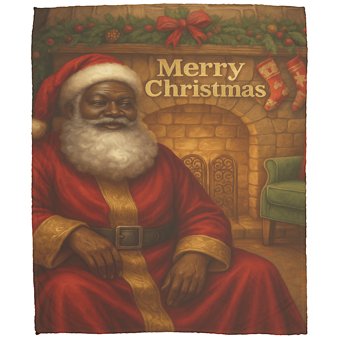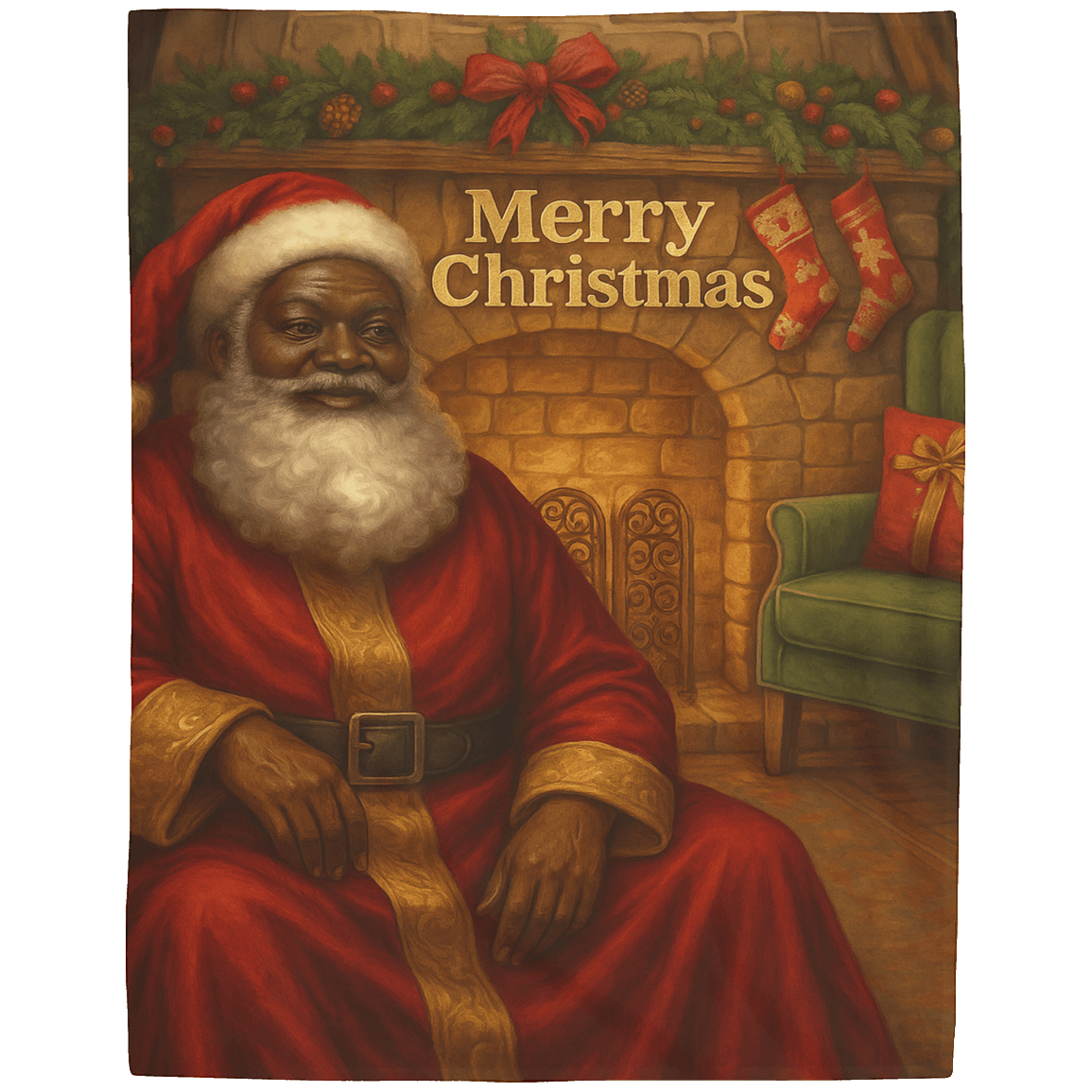 Featuring a heartwarming depiction of a joyful Black Santa Claus seated by a glowing fireplace, this luxurious blanket brings heritage and holiday spirit together in a festive, feel-good design. Stockings hang above the fire, a vibrant green armchair adds charm, and the golden words “Merry Christmas” complete the cozy scene.
