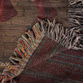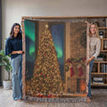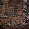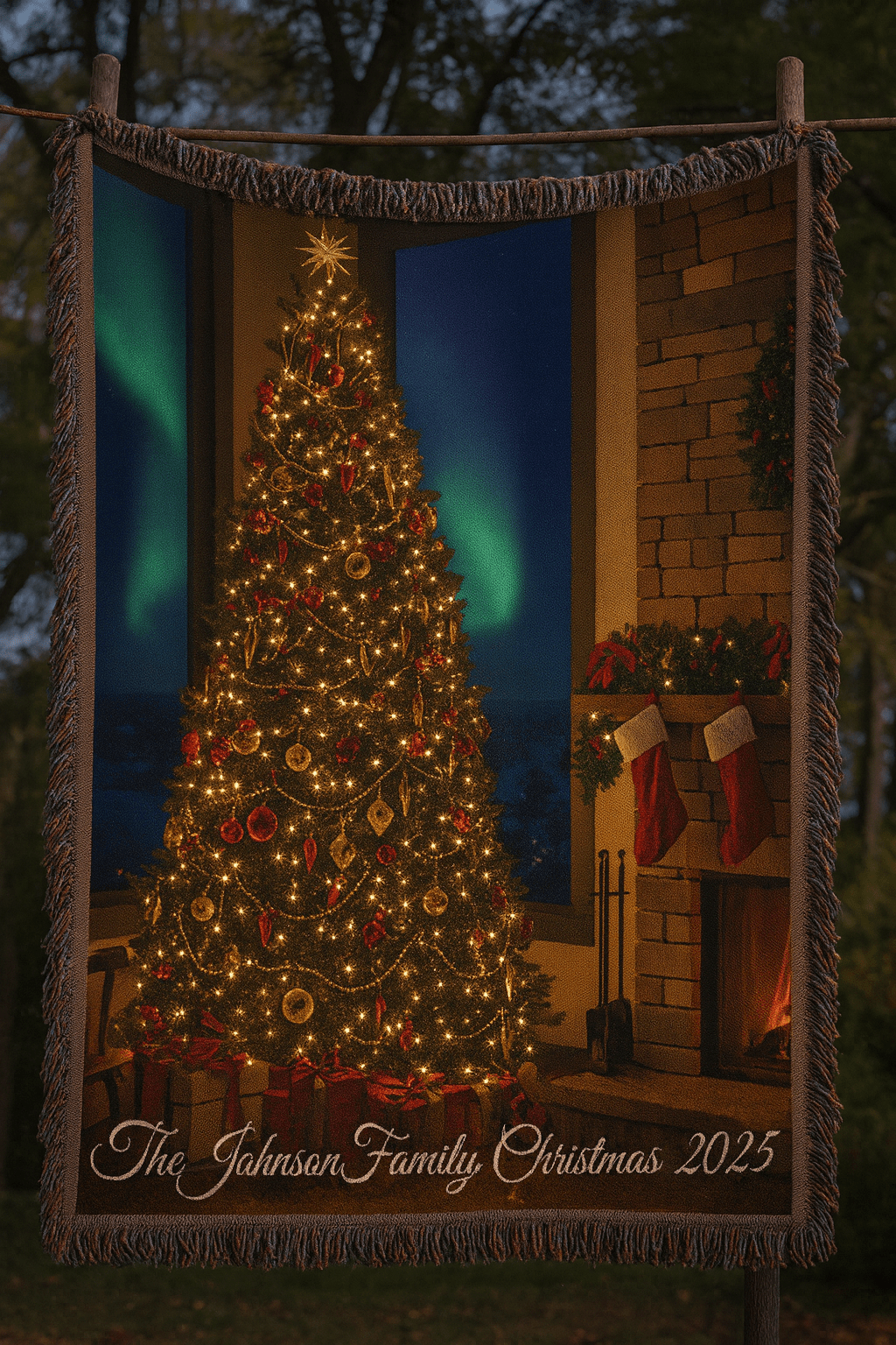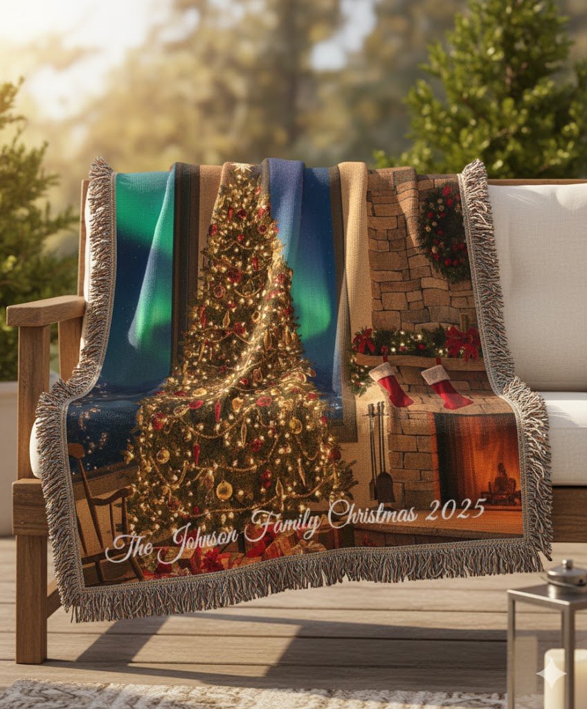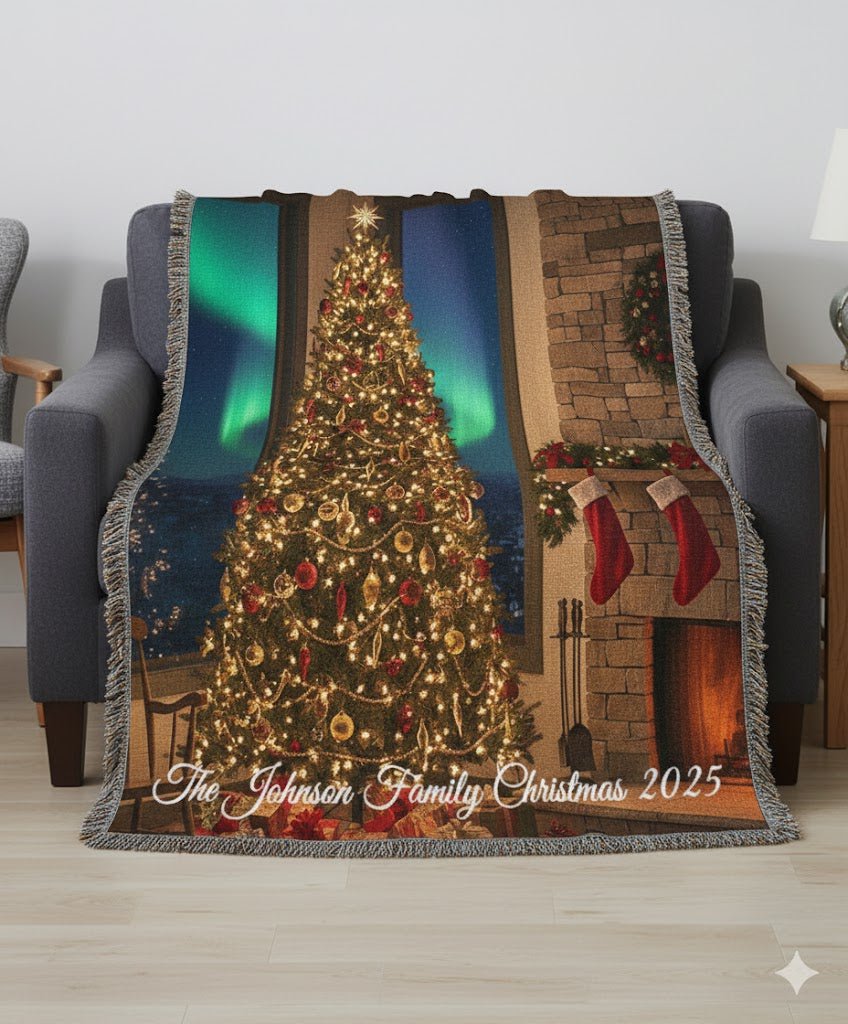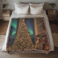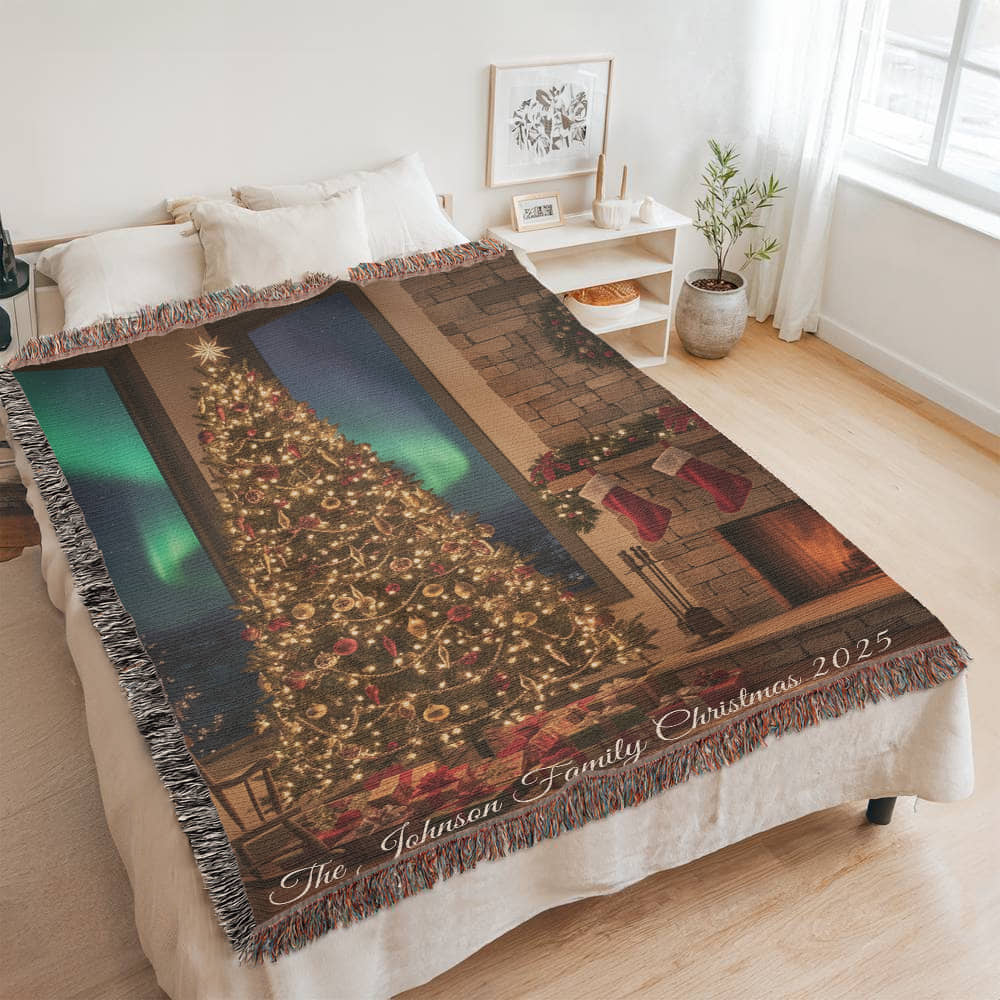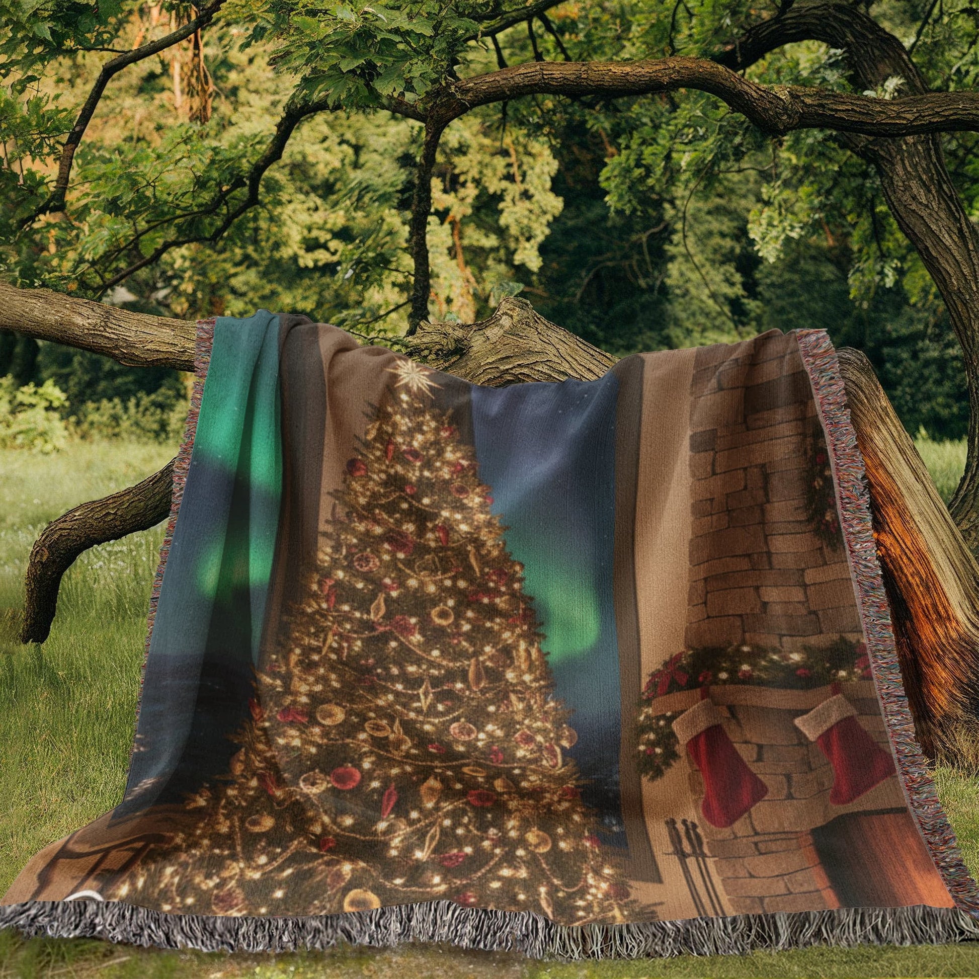 - Features a stunning woven depiction of a Christmas scene with a tree and stockings