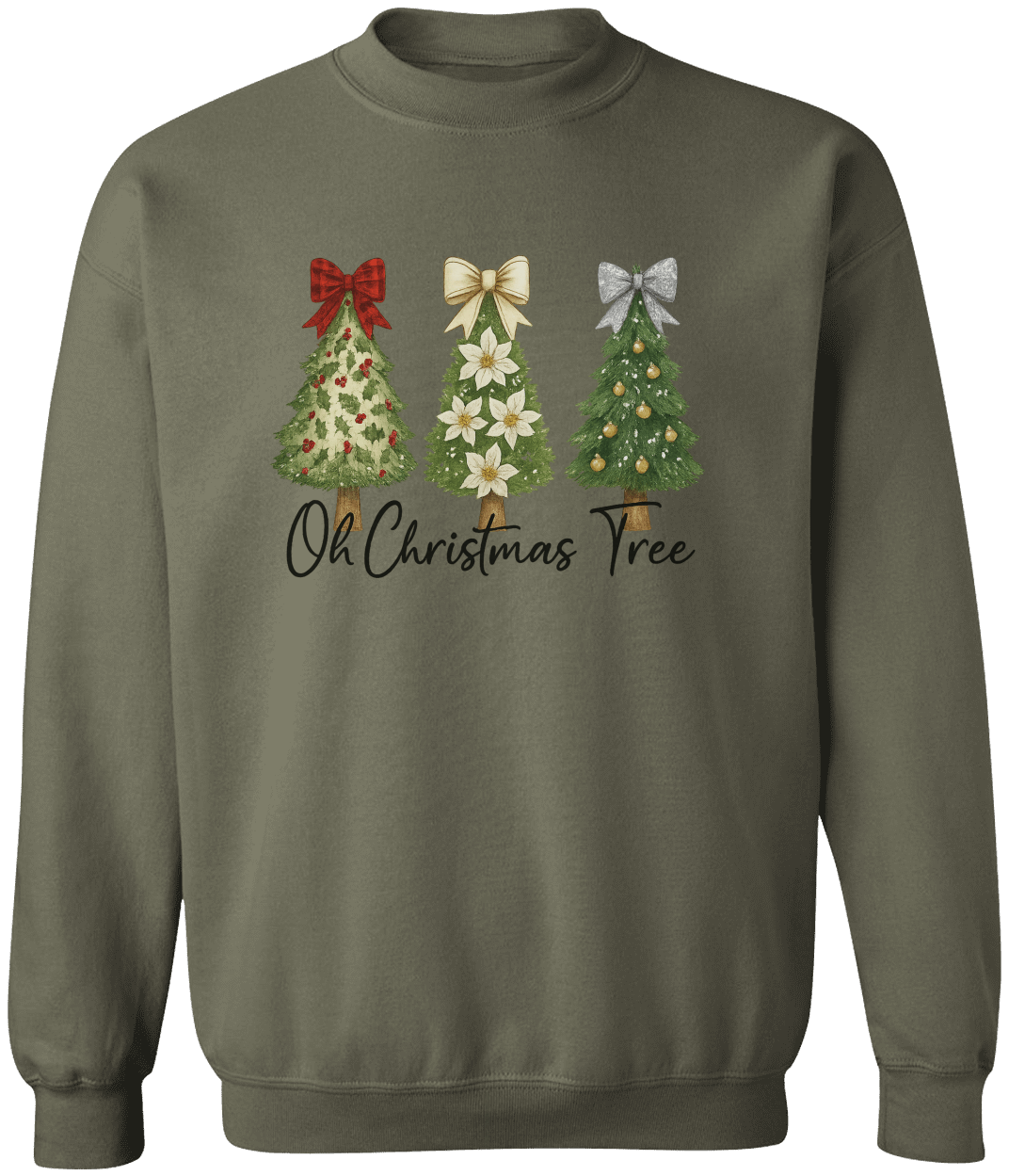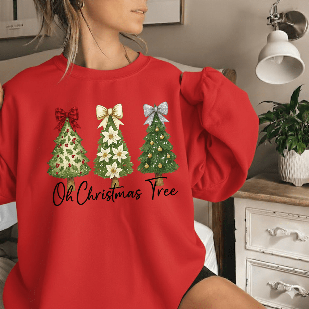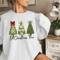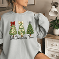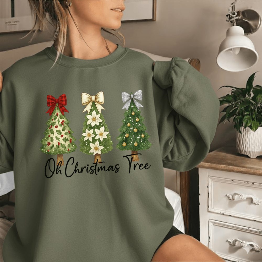 Embrace the festive spirit with our Oh Christmas Tree Graphic Sweatshirt, perfect for holiday gatherings and cozy winter days. This green sweatshirt features a charming design of three Christmas trees, each adorned with bows and delicate decorations, capturing the essence of the holiday season.