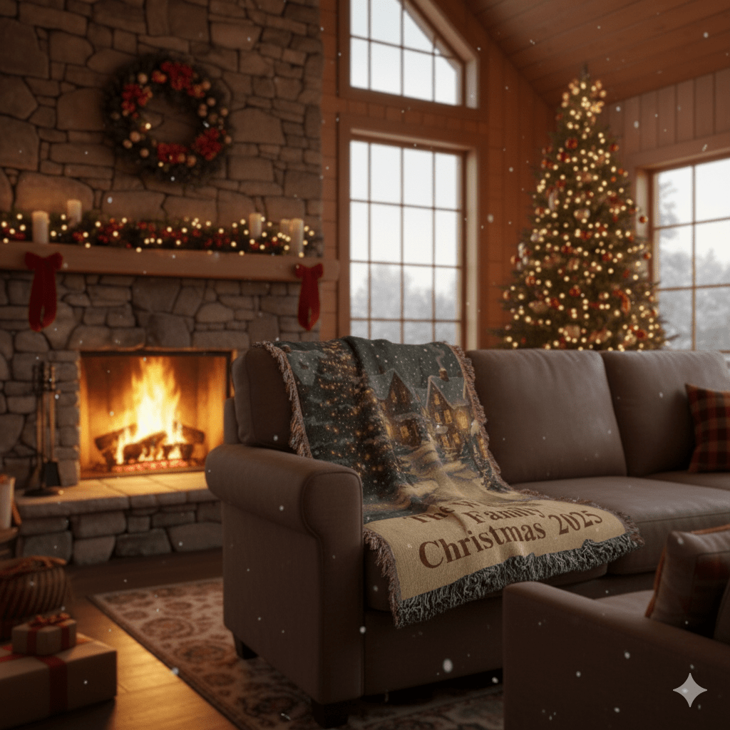 Wrap your family in holiday warmth with our enchanting Personalized Christmas Woven Blanket featuring a serene snowy village scene. This heirloom-quality blanket, crafted from soft, 100% cotton yarn, beautifully showcases a quaint village blanketed in snow, with softly lit windows and snow-capped roofs that evoke the nostalgic charm of Christmases past. Personalized with your family name, it becomes a cherished keepsake, perfect for cozy winter evenings.