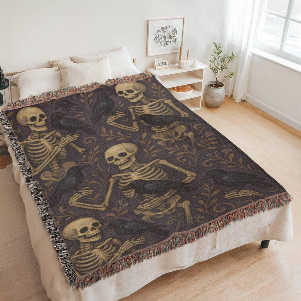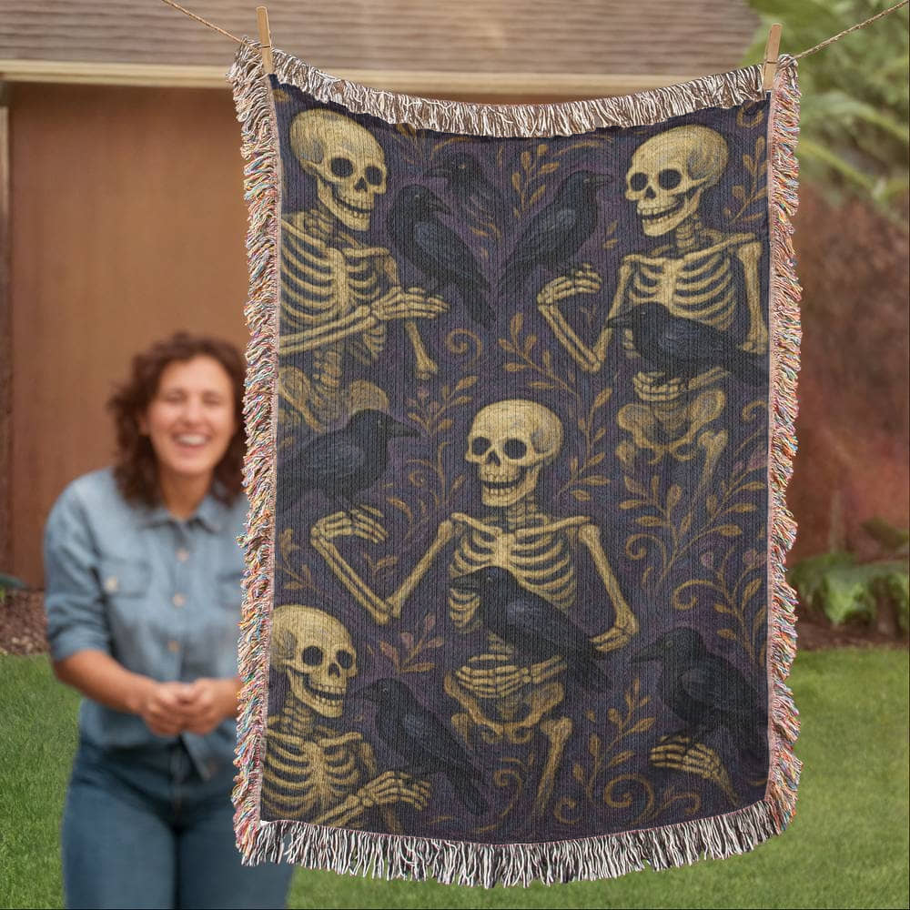 Create a one-of-a-kind keepsake with our Heirloom Artwork Skeletons & Ravens Woven Blanket. Each blanket is expertly woven on a traditional loom with soft, 100% cotton yarn, bringing every gothic detail to life with timeless craftsmanship.