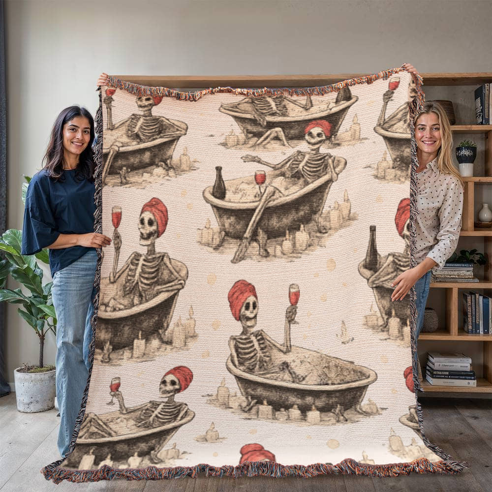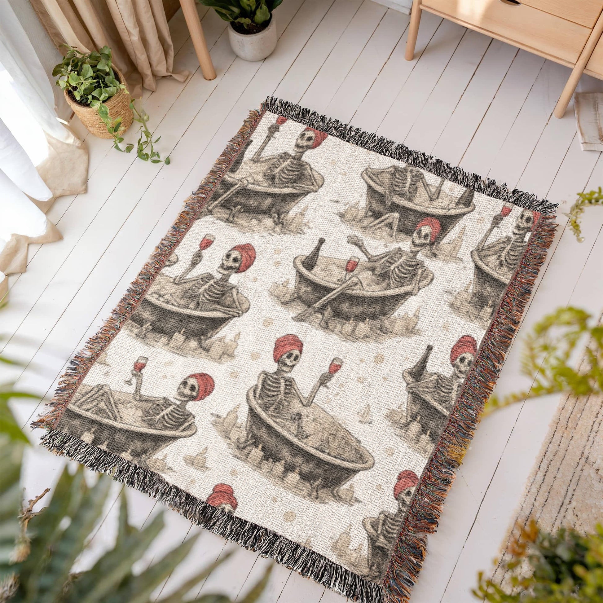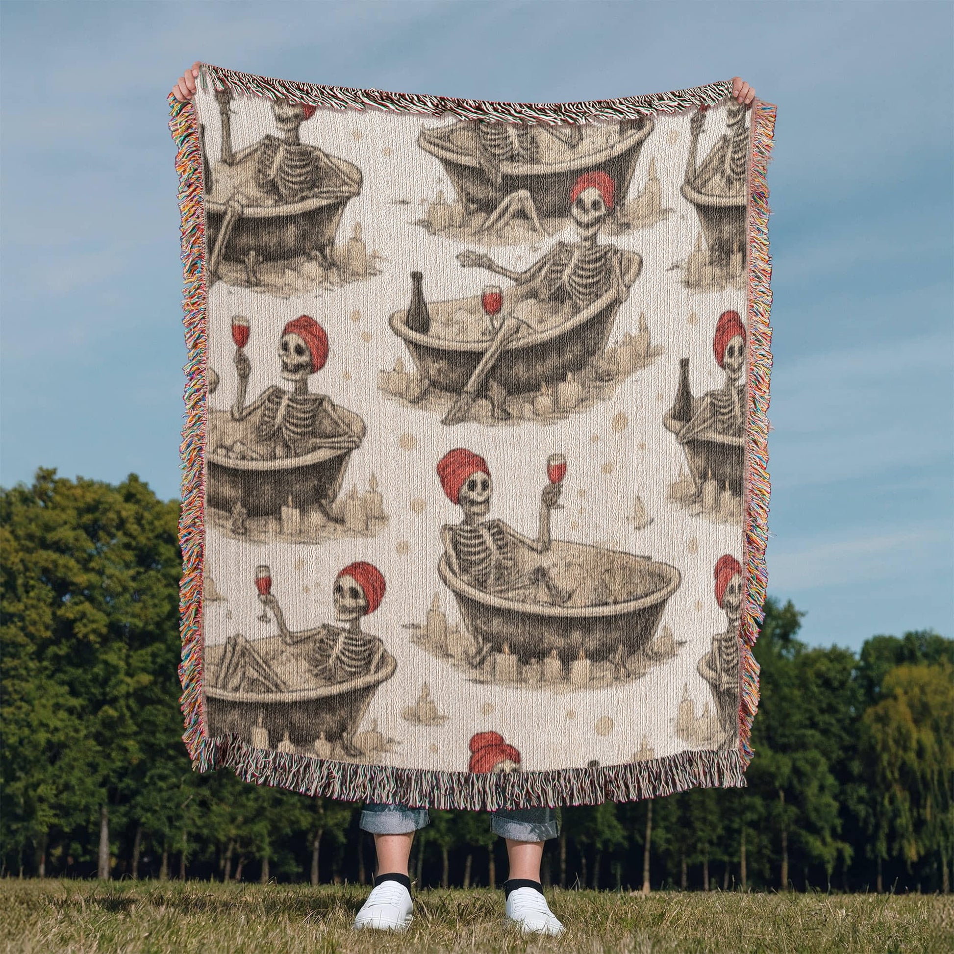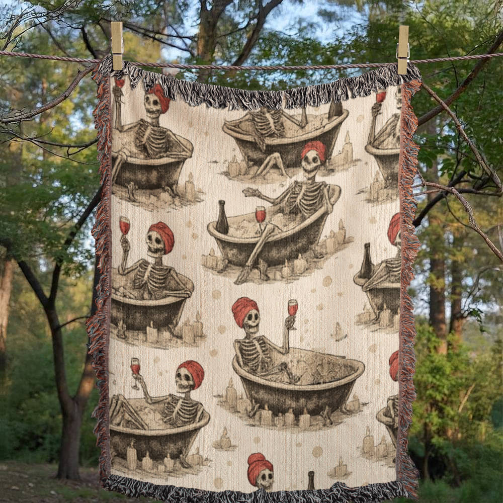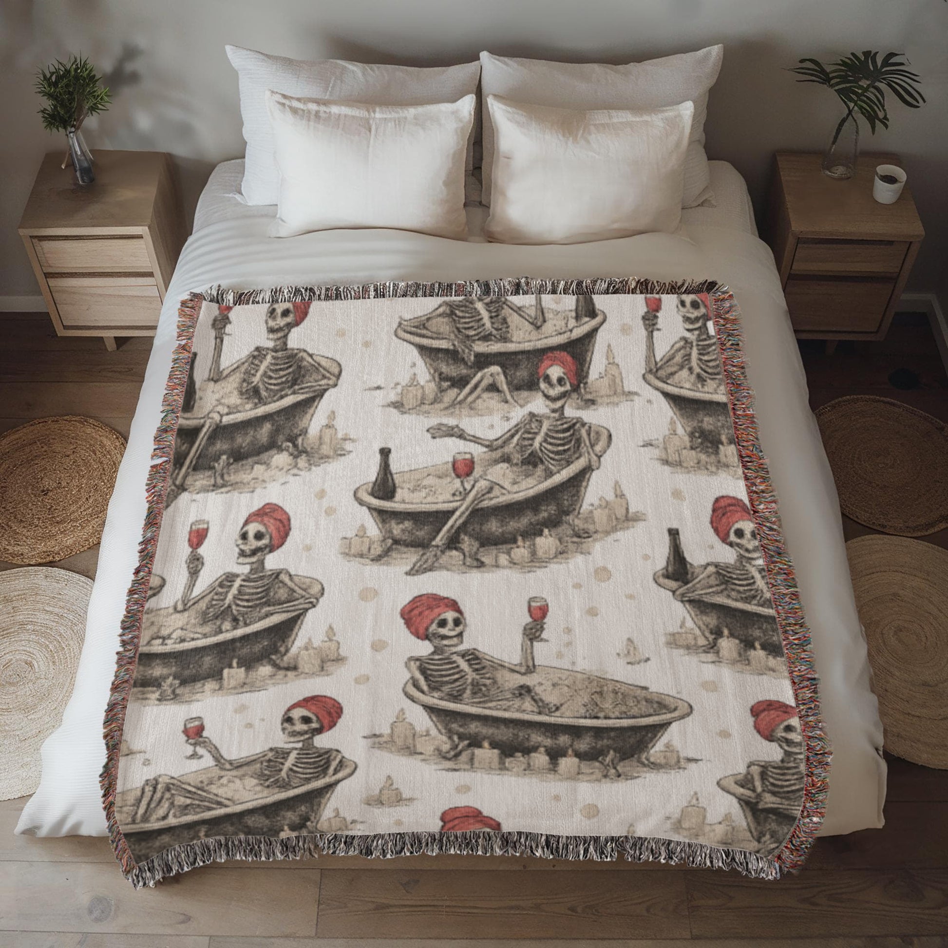 Wrap yourself—or someone you love—in spooky sophistication with our Heirloom Artwork Woven Blanket: Soak & Bones – The Haunted Spa Edition. Lovingly woven on a traditional loom with ultra-soft, 100% cotton yarn, this unique keepsake blends gothic charm with cozy luxury.
