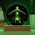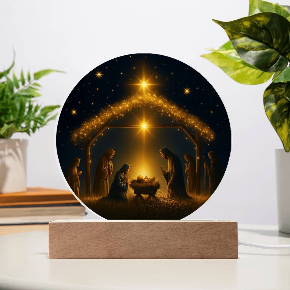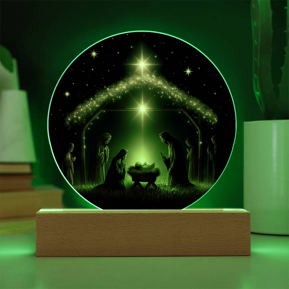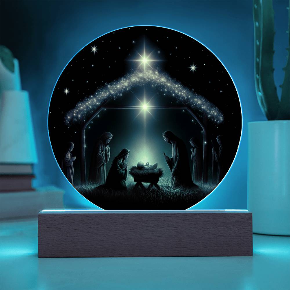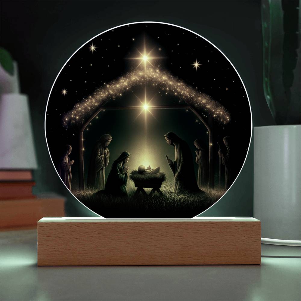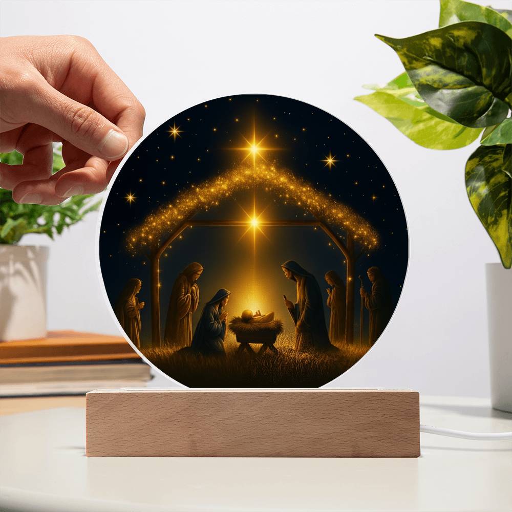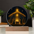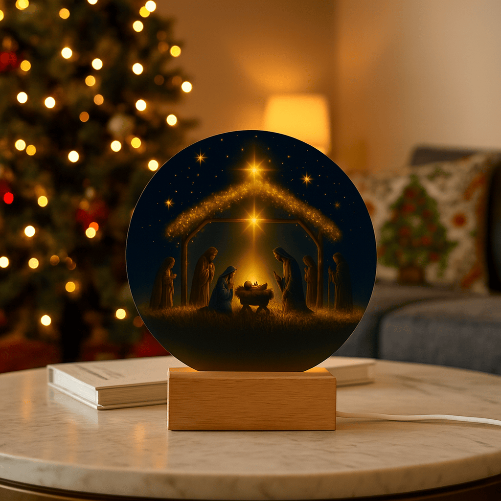This exquisite round plaque is crafted from premium acrylic and features a vibrantly printed Nativity design. The wooden LED base enhances the display with a soft, radiant glow—perfect for creating a peaceful ambiance during the holiday season or all year round.