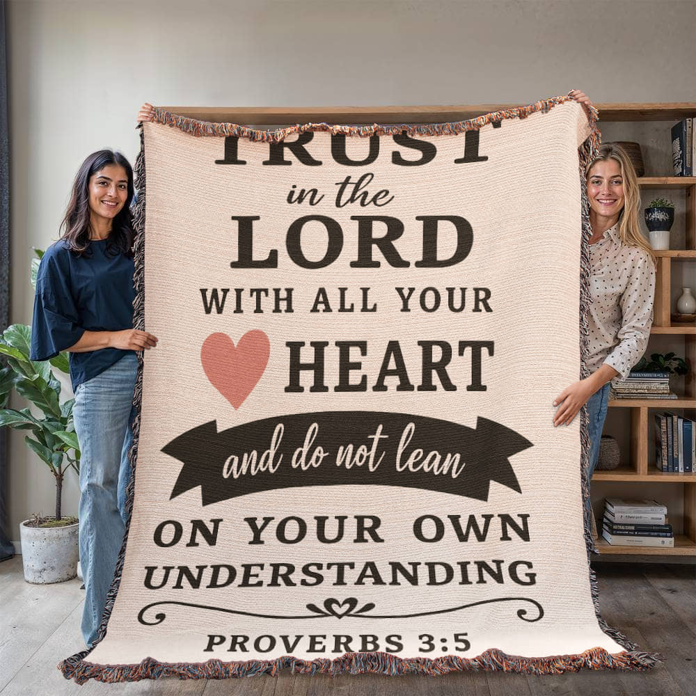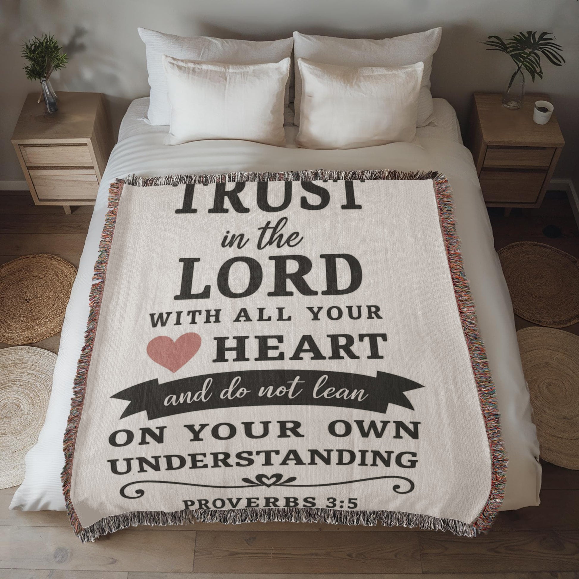 Wrap your faith in comfort and beauty with our "Trust in the Lord with All Your Heart" woven blanket. Thoughtfully woven on a traditional loom with soft, 100% cotton yarn, this blanket brings scripture to life as a timeless, heirloom-quality keepsake.